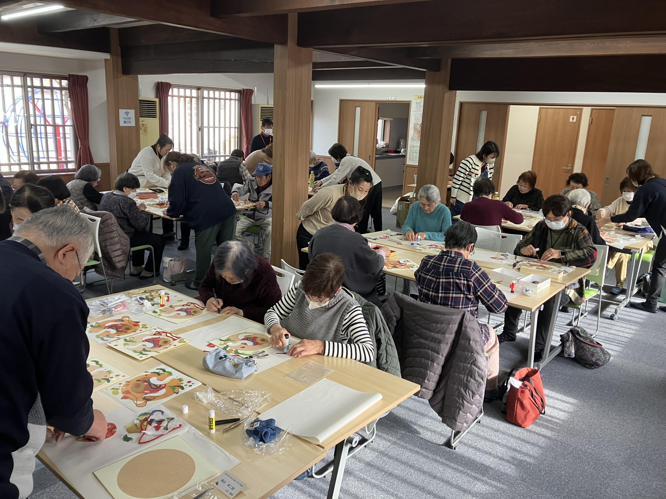 民生児童委員と協力委員さんの指導の下31名の参加があり、要領のいい人そうでない人それぞれに来年のへび年のデザインを色紙上に準備された紙をちぎって貼りつけてきました。皆さん素晴らしい出来栄えで満足のうちに終了しました。