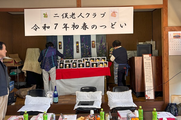 令和7年1月11日(土)二俣老人クラブ会員44名が老人ホームに集い 暖かい天候の中でお正月料理を囲み歓談 楽しいひとときでした。手芸部のくるみ絵展示も花を添えました。係の皆様ご苦労様でした。