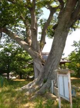 尚、この築山には近くから見ると一本のように見える大樹(写真下)がある。この木は、二本の榎が一本のムクノキを両脇から包み込むような形で成長して、三本あわせた木の周囲は7mにもなる。