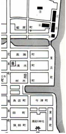 相生橋近くの高砂川に永楽橋がかかる。江戸期、その北の高砂川にそって地図のような施設(①~⑤)があった。